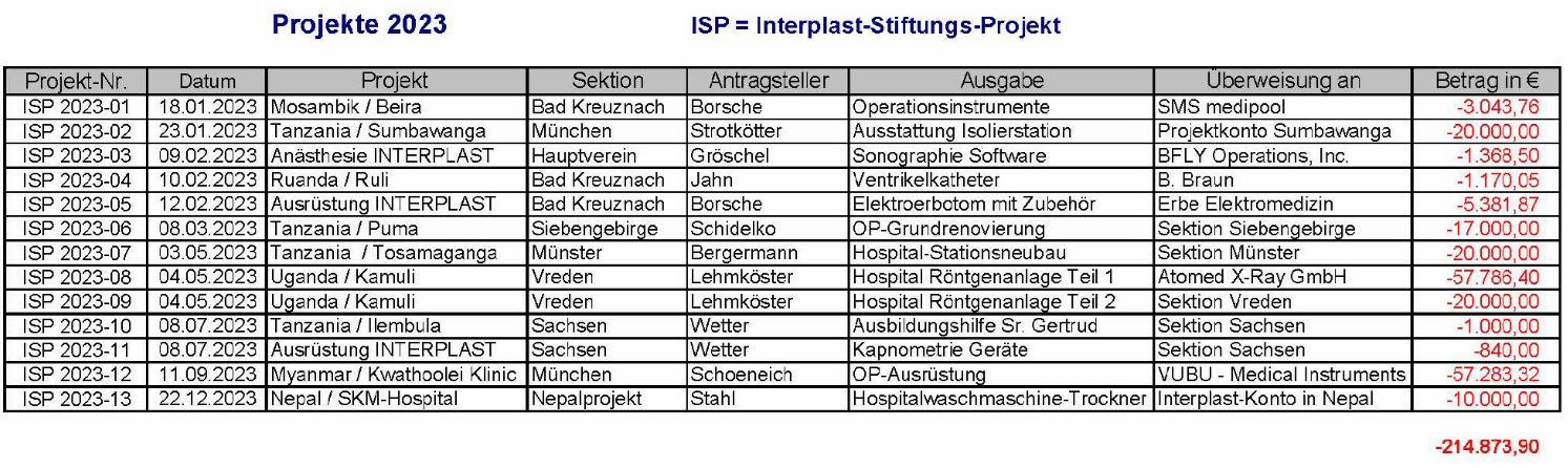 Das Brasilienprojekt benötigt neue Operationstische und ein Anästhesiegerät. Die digitale Röntgenanlage für das Kamuli Hospital in Uganda soll fertiggestellt werden. Eine Solaranlage ist für das Hospital in Santa Cruz/ Bolivien vorgesehen. In Myanmar ist die Ausstattung eines Operationssaales zu komplettieren. Außerdem sind weitere Anschaffungen zur Anästhesieausrüstung für INTERPLAST-Einsätze geplant.