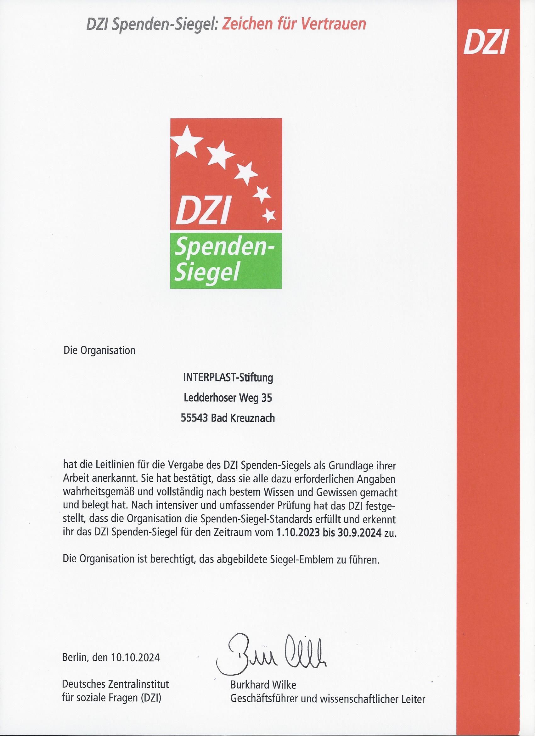 Nach den strengen Kriterien des Deutschen Zentralinstituts für soziale Fragen (DZI) in Berlin, wurde nun auch die INTERPLAST-Stiftung mit dem DZI-Spenden-Siegel ausgezeichnet und in die Liste der empfohlenen Hilfsorganisationen aufgenommen.